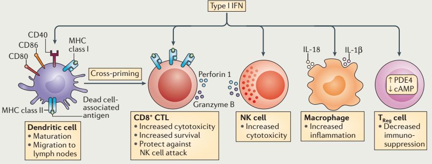 而由於1型乾擾素還能促進多種免疫細胞的免疫功能(如下圖所示),在腫瘤免疫中發揮著重要作用[4]。