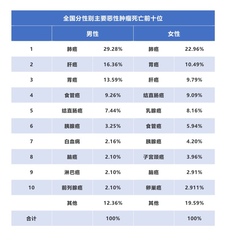 男性和女性的惡性腫瘤死因順位略有差異。男性依次為肺癌、肝癌、胃癌、食管癌和結直腸癌等,男性前10位惡性腫瘤死亡約佔男性全部惡性腫瘤死亡的87.60%。女性主要惡性腫瘤死因順位依次為肺癌、胃癌、肝癌、結直腸癌和乳腺癌,女性前10位惡性腫瘤死亡約佔女性全部惡性腫瘤死亡的80.50%。