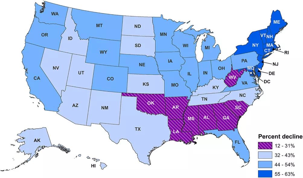 國家在1988-90至2013-15期間乳腺癌死亡率下降數據來源:美國國家衛生統計中心。