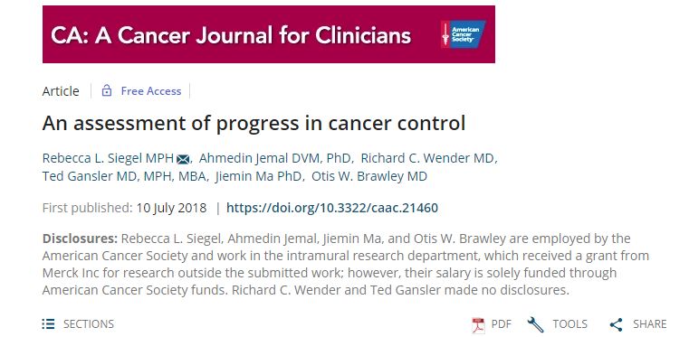 文章詳細分析了1930〜2010年這80年期間美國癌症死亡率改變和原因,為未來降低癌症死亡率的工作規劃了方向。