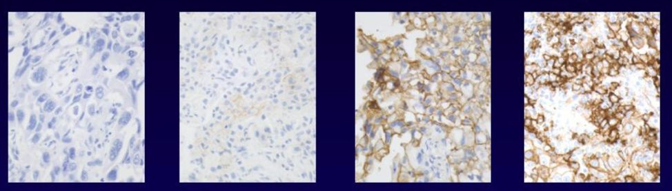 PD-L1蛋白表達是通過褐色展示,染色越深,覆蓋的細胞越多,陽性越強。上圖中,最左邊是一個陰性組織(PD-L1染色陽性細胞<1%),最右邊則是強陽性的組織(PD-L1染色陽性細胞>50%)。