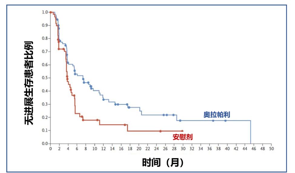 在代號為“ POLO” 的試驗中,奧拉帕利被用於攜帶遺傳性 BRCA 基因突變的胰腺癌患者的一線含鉑化療的維持治療,結果把中位無進展生存期幾乎延長了一倍!從對照組的 3.8 個月,提高到了 7.4 個月。